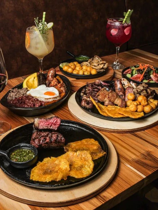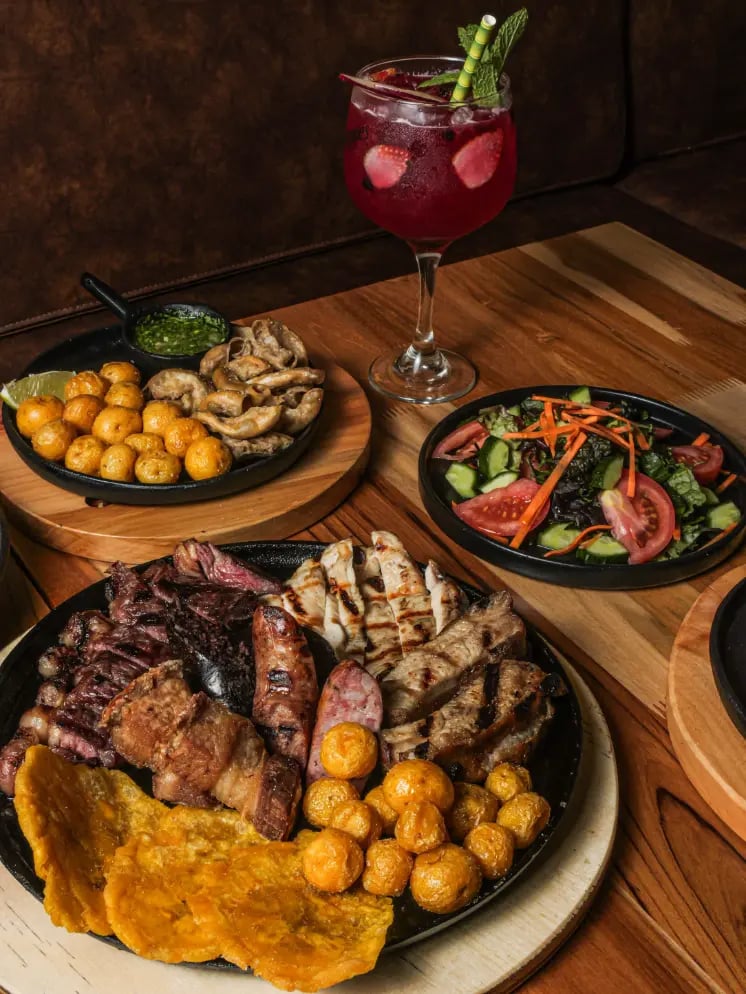 Entre las preparaciones más representativas se encuentran carnes a la parrilla con acompañamientos tradicionales, picadas colombianas para compartir, arepas, papas criollas y otros platos que forman parte de la cocina tradicional del país.