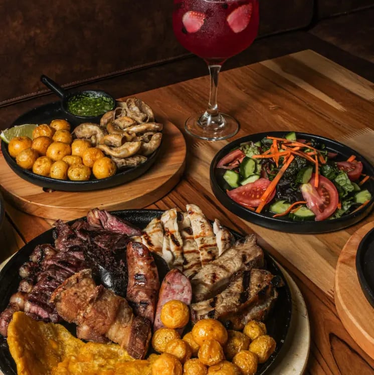 Tablas de carne a la parrilla acompañadas de guarniciones tradicionales como arepas o papas criollas, pensadas para disfrutar entre varias personas.